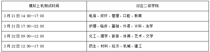 请考生按照对照表的时间准时参加模拟上机测试,逾期不再安排模拟测试环节。