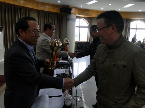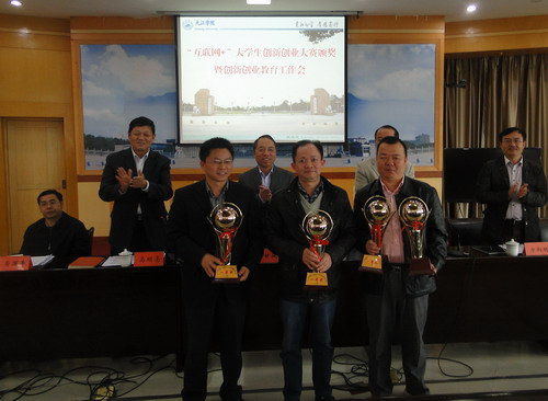 会上,实验中心主任方向明宣读了《九江学院关于公布“互联网+”大学生创新创业大赛校园赛获奖名单的通知》。经个人申报,二级学院推荐,学校组织专家评审,评选出一等奖6个,二等奖10个,三等奖12个,优秀组织奖3个。甘校长、陶副校长和在主席台就座的领导小组办公室负责人向获奖二级学院代表颁发了奖杯和奖牌。