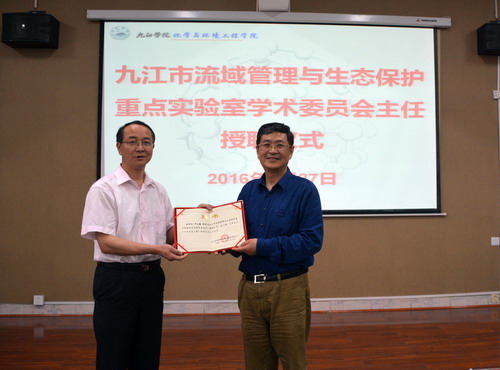 陶副校长为尹教授颁发了九江市流域管理与生态保护重点实验室学术委员会主任的聘书。尹教授表示,很高兴能够为九江学院和市重点实验室的发展贡献微薄之力。