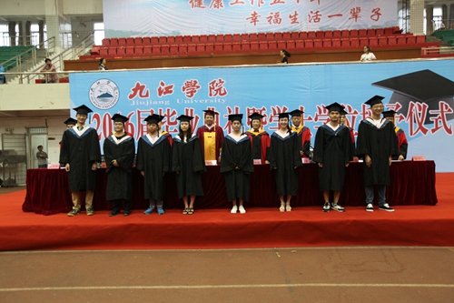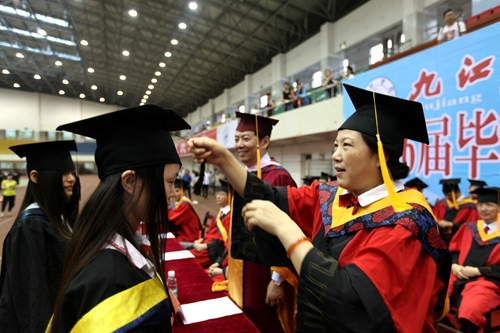 接着,在庄严神圣的气氛中,举行了隆重的学位授予仪式。伴随着欢快的音乐,身着鲜红导师服的全体校领导健步走到列队等候的毕业生队伍前,亲手为40名身着学士学位服的学生代表一一正冠拨苏,并与他们握手和合影留念。庄严的学士服与张张青春朝气的笑脸交相辉映,豪情壮志激荡在每位毕业学子的心中。阳光自信的九江学院学子,身着端庄稳重的学士服,整装待发。鞠躬、握手、拥抱,他们用最真诚的方式来感谢母校、感谢师长,他们用最动人的微笑为大学四年的学习历程划上了圆满的句点。