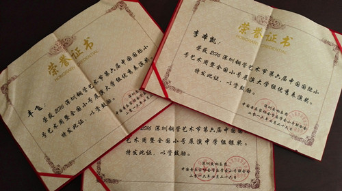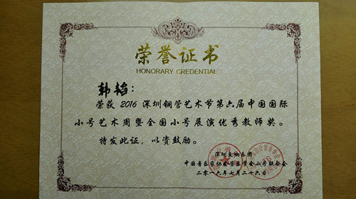随后在中国音乐家协会举办的第五届“中国音乐小金钟”管乐独奏展演中由韩韬老师推荐的项轲憬同学,又收获了一名优秀奖。