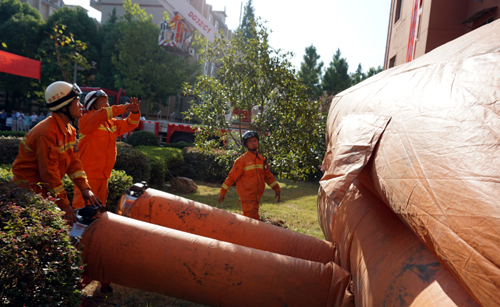 接报后,三辆消防车迅速到达现场,消防官兵立即展开作业。一组迅速架起高压水枪,对准“着火”窗口喷水灭火;一组铺起逃生气垫,组织低层被困人员跳下;一组迅速架起云梯,营救高层被困人员。