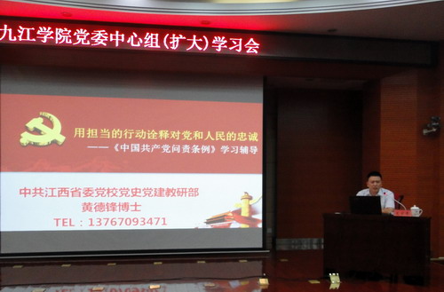 为推进“两学一做”学习教育的深入开展,学习贯彻《中国共产党问责条例》,9月23日下午,学校在逸夫图书馆学术报告厅召开9月份党委中心组(扩大)学习会,专题学习了《中国共产党问责条例》,中共江西省委党校党史党建教研部黄德锋博士应邀作了题为《用担当的行为诠释对党和人民的忠诚——<中国共产党问责条例>解读》的专题辅导讲座。在家校领导、全校副处以上领导干部参加了报告会,报告会由党委书记郑翔主持。