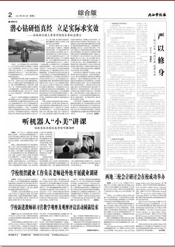 近日,中国高校校报协会公布2015年度中国高校校报好新闻评选结果和奖励通知。《九江学院报》两件新闻作品获奖,其中《听机器人“小美”讲课》(作者:李龙)获得消息类二等奖,《“教学剩余”是学校发展理念的重大转变》(作者:冯健、李勤合)获得言论类三等奖。