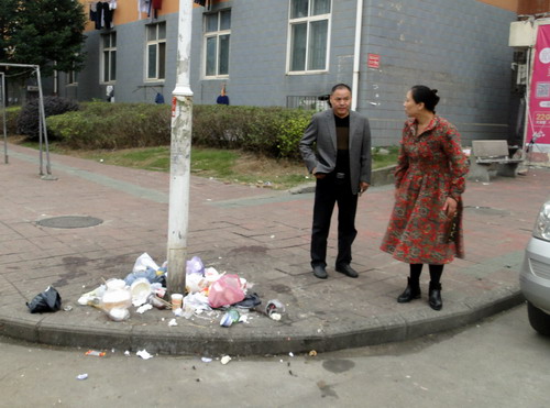 在四服务楼和学生宿舍30栋交界处的地上堆着垃圾,杨副校长要求后勤管理处在此处增放一个垃圾桶,方便师生。