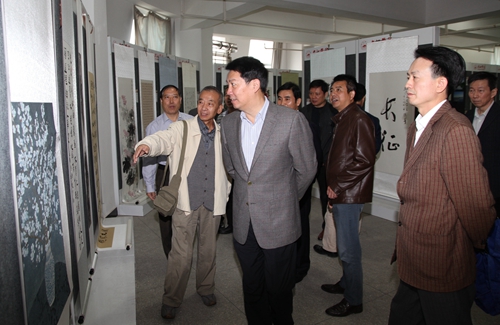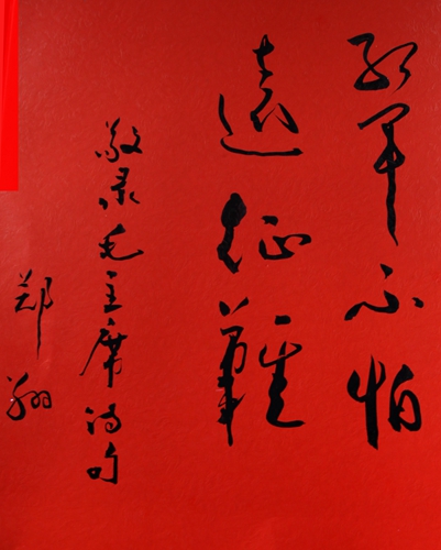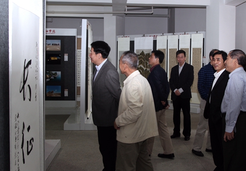 丹青献瑞,翰墨流香,镜像叠彩,歌诗呈祥,好一派升平气象。校领导一行来到逸夫楼书画摄影展览厅。首先进入眼帘是展览前言、“长征”书法作品,“长征”两字是校党委书记郑翔为本次展览所书。接着,是几幅在国内、省内享有盛誉的我校离退休教师的书画作品,郑翔等校领导仔细地观看了这些书画作品,了解了作品及其作者本人的有关情况。郑翔等校领导还一一地观看了其他在职教职工和离退休职工的书画摄影作品,并对本次展览组织工作以及展出的作品给予了充分肯定。郑翔还在现场挥毫敬录毛主席诗句:红军不怕远征难。