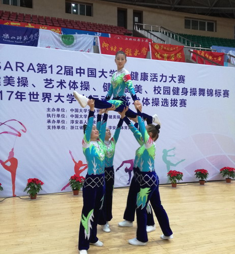 11月12日~19日,第12届中国大学生健康活力大赛暨2017年世界大学生运动会艺术体操比赛在浙江省淳安市举行,我校健美操队奋力拼搏,获得女子五人操第三名和混合三人操第四名的好成绩,这是我校健美操队在此类比赛中取得的历史性突破。