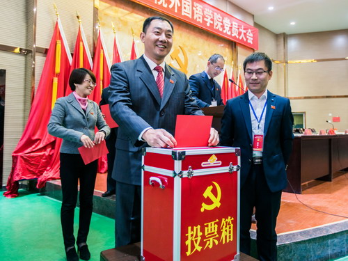 大会酝酿通过了外国语学院新一届党委委员候选人名单,表决通过了总监票人、监票人名单。根据《中共九江学院外国语学院党员大会选举办法》,以无记名差额选举的方式,由全体正式党员投票选举产生了新一届中共九江学院外国语学院委员会委员(以姓氏笔画为序):王伟、邓海波、杨杰、罗其娟、柴克清、韩琨、彭晓。