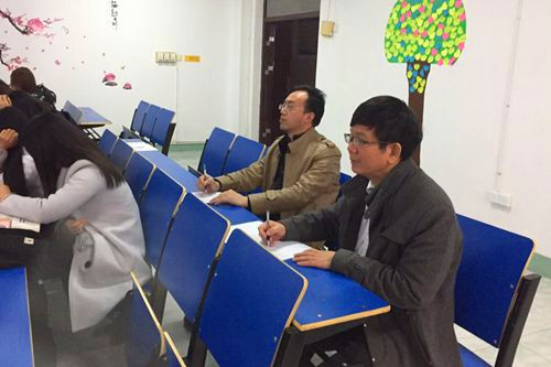 12月13日下午,王万山副校长来到竞秀楼207教室,与电子商务学院B1513/14班同学一起听了谭晓波老师讲授的《网页设计》课程。电子商务学院副院长郑孝庭一同听课。