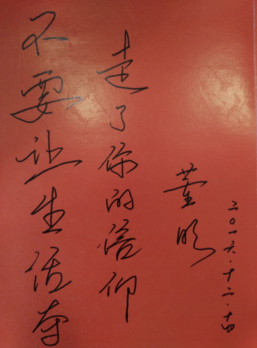 最后,董明老师用一句话为本场讲座画上了一个圆满的句号。她说:“不要因为生活夺走了我们最初的梦想,不要因为生活的坎坷和残酷夺走了我们的善良,更不要因为生活的诱惑和艰辛夺走了我们内心真正的信仰。感恩在场的每一个听取她分享的每一个人。”讲座结束后,董明老师为我校濂溪讲坛题词:“不要让生活夺走了你的信仰。”