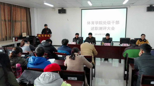 述职测评会上,院党委书记付和忠和院长王勤分别代表体育学院党委、行政对2016年学院的工作进行了总结汇报,并就个人年度工作作了述职。随后班子其他成员进行了述职。述职结束后,全体教职工对学院领导班子及处级干部个人年度工作进行了测评。