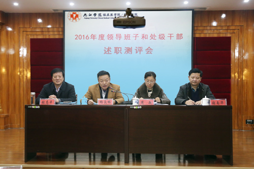 1月5日下午,临床医学院/附属医院分别在四楼会议室和九楼会议室,召开了2016年党委民主生活会和院领导班子述职测评大会。九江学院副校长杨焱林,统战部部长、组织人事部副部长周敏,组织人事部综合科科长张杨帆,临床医学院/附属医院班子成员及中层以上干部参加了述职大会。