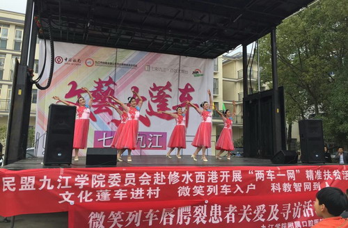 推进文化扶贫、补齐文化短板,以文化扶贫助推文化小康。民盟九江学院委员会联合民盟九江文艺支部,把文化大篷车开进村镇,通过精心编排的脱贫致富故事、移风易俗的文艺节目和正能量接地气的文化表演,极大地丰富了村镇群众的精神生活,增强了村民脱贫致富的信心与斗志,提升了群众的文化水平。