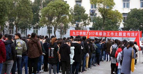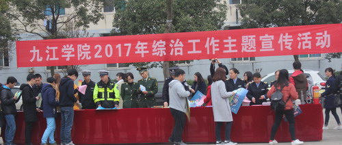 为推动广大师生积极参与校园治安综合治理,共同建设和谐校园,在校园营造“综治工作人人有责,和谐校园人人共享”的浓厚氛围,根据学校2017年度综治工作安排,3月17日上午,学校在学生活动广场举办了2017年度综治工作主题宣传活动,拉开今年综治宣传的帷幕。副校长夏启国出席活动并观看了宣传展板,信息学院、外语学院、化环学院、理学院、机材学院、后勤管理处、学生处、保卫处负责人及500余名师生参加了活动。