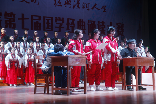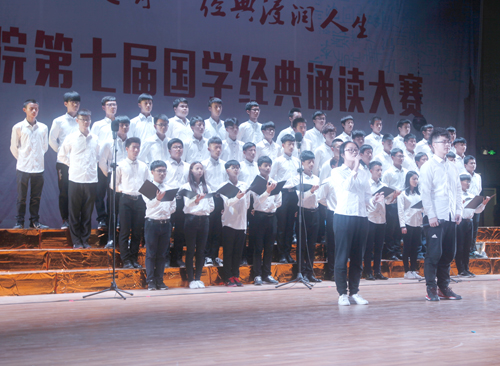 诗以言志,歌以壮行。在预赛中胜出的化环学院、文传学院、外国语学院等10支代表队,深情演绎了《春江花月夜》《红岩魂》《丝绸之路》等经典篇目。比赛中,选手们全身心投入,台上一边是同学们深情并茂的高声吟诵,一边是他们精心设计的舞蹈、歌唱、舞台剧,在声、光、电等现代技术的配合下,同学们用自己的方式诵国学、唱国学、演国学。同学们的精彩演出让大家感悟到了中华经典文化的魅力。比赛现场,来自柬埔寨的留学生们为大家奉献了《祈福舞》,他们的助演得到了大家的阵阵掌声。