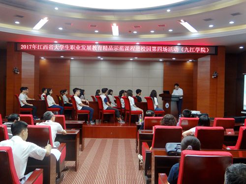 传生涯理念、走规划方略、强实战技能、助教学相长。6月13日下午,由省教育厅主办,省高等院校毕业生就业工作办公室承办,九江学院协办的2017年江西省大学生职业发展教育精品示范课程进校园活动第四场在我校逸夫图书馆学术报告厅举行。省就业办公室副主任舒正鸣,就业管理科科长游京峰、副科长李白玲出席此次活动;江西建设职业技术学院、江西财经职业学院、九江职业技术学院、九江职业大学和九江学院有关师生代表300余人参加了此次活动。活动由九江学院招生就业处处长肖国丰主持。