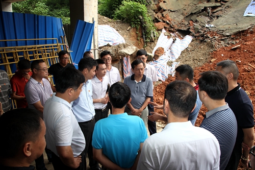 6月26日上午,九江市副市长孙金淼一行到濂溪区“新天地”项目工地,调研查看并了解该项目一护坡山体因连日降雨而再次发生大面积塌方情况,并现场指导防治工作。九江学院党委书记赵伟、副校长夏启国,以及学校党院办、保卫处、基建处、国资处、后勤管理处等相关部门负责人等陪同调研。