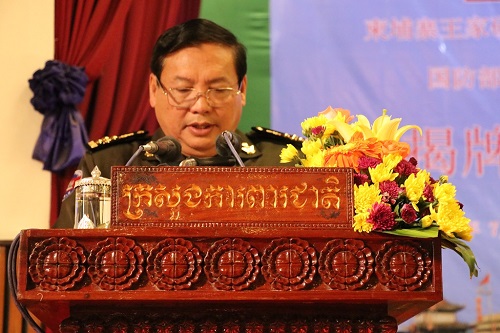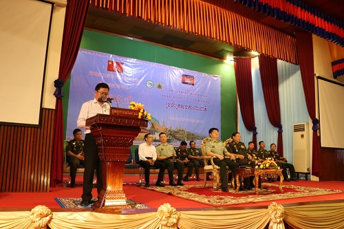 晋翁副部长代表柬埔寨副总理兼国防部长迪班致辞,他说,中柬友谊源远流长,两国从1958年建交以来,发展了深厚的友谊。两国的军队关系紧密,去年我随同迪班副总理访华,两军之间签订了多项合作协议。他感谢柬埔寨孔子学院在国防部设立汉语中心,帮助柬埔寨官兵学习汉语,他要求学员们努力学好汉语,“学好中国话,朋友遍天下”,为两国军队的交流作出贡献。他希望中国驻柬大使馆给予更多支持,为优秀学员提供奖学金,赴中国留学。