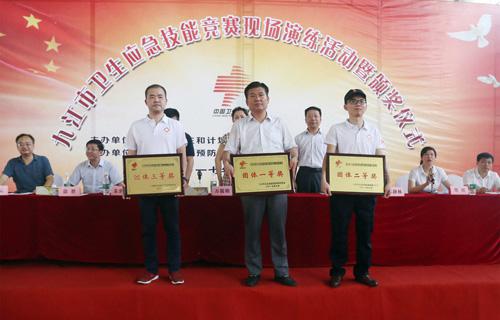 为积极响应国家卫计委和省卫计委提出的卫生应急竞赛活动要求,提升广大卫生应急工作人员的业务能力和专业水平,7月28日,由市卫计委组织的九江市卫生应急技能竞赛表演及颁奖活动,在九江职大新校区体育馆举行。省卫计委副主任万筱明、九江市政协副主席严平及市总工会、市卫计委、市疾控中心、市急救中心等领导出席了活动。临床医学院/附属医院纪委刘英明书记、急诊科但传军主任带队参加,参赛队喜获团体一等奖佳绩。