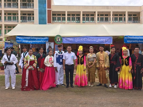10月7日上午8:30,柬埔寨王国副总理高金然阁下(H.E.Ke KimYan)莅临柬埔寨棉芷大学视察工作,并为卜迭棉芷省优秀高中生颁发奖品。棉芷大学中文系全体教师带领中文系学生身着中国和柬埔寨传统服装迎接高金然副总理的到来。