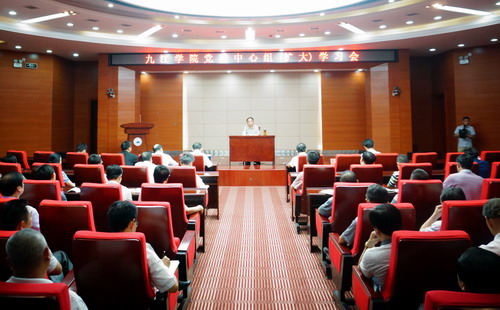 三是营造良好氛围。学校还通过各个途径全面展示党的十八大以来社会主义现代化建设事业和学校改革发展成就,为迎接党的十九大胜利召开营造良好氛围。开学伊始,学校全面贯彻中央和省委关于加强和改进高校思想政治工作的部署,努力开创学校各项事业发展的新局面。9月29日和10月10日,学校先后隆重举行“浩鹏明德奖”和“新华教育奖”捐赠仪式,用优秀校友和九江籍知名企业家捐资助学的生动事例教育广大师生,要立德树人,感恩社会,回报社会。10月11日,学校隆重举行抗洪英雄事迹报告会,用抗洪英雄们的感人事迹、无私品格和崇高精神,感染、影响和激励全校师生,为他们上了一堂生动的思想政治教育课。9月25日,学校召开党委中心组(扩大)学习会,邀请中国社会科学院马克思主义研究院党委书记、院长邓纯东教授来我校作《高度重视国家意识形态建设 努力巩固马克思主义指导地位》专题报告。近期,学校还将举办“赣籍开国将军百战图”大型创作展览巡展、“第七届金秋教职工书画摄影展”等多项活动迎接党的十九大。