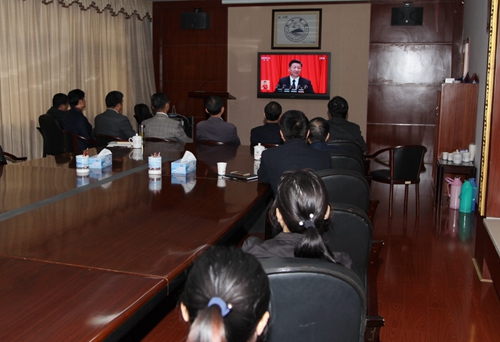 上午9时,校领导赵伟、刘晓东、魏立平、王万山、陈春生、杨耀防、夏启国等在行政办公楼四楼党委会议室集体收看了十九大开幕式,各二级学院党委、团委在各单位会议室,以及学生食堂师生一起集体收看,共同关注这一历史性的盛会。