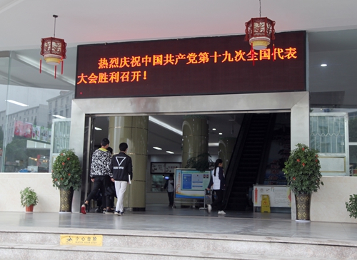 在主校区北大门、西大门、学生三食堂大门,以及各校区等有“热烈祝贺中国共产党第十九次全国代表大会胜利召开”等宣传牌或电子屏,传递了我校广大师生迎接大会召开的喜悦心情,营造了浓重热烈的庆祝氛围。教职员工、同学们怀着激动而喜悦的心情收看十九大开幕式,专注认真地聆听习近平总书记的报告,手中的笔不停地记录着。