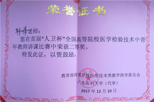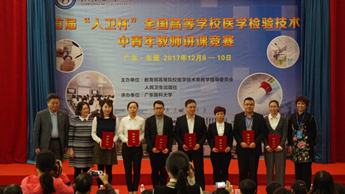 为进一步提升全国高等院校医学检验技术中青年教师的教学能力和业务水平,展示中青年教师教学风采,12月8日至10日,由教育部高等院校医学技术类教学指导委员会和人民卫生出版社共同主办的首届“人卫杯”全国高等院校医学检验技术中青年教师讲课竞赛在广东医科大学东莞校区举行,我校基础医学院病原与免疫教研室龙锴博士、临床医学院/附属医院医学检验教研室韩峰老师参加此次竞赛,两人均荣获二等奖。
