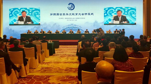 开幕式上,杨洁篪高度评价海外侨胞对华文教育做出的重要贡献,殷切期望海外华文教育事业更加繁荣发展。杨洁篪说,党中央、国务院十分关心海外华文教育事业,海外华文教育标准化、正规化、专业化建设取得了新进展新成效,希望广大华文教育工作者树立高度文化自信,坚守华文教育阵地的职责使命,努力提高华文学校的教学质量和办学水平。裘援平做了题为《深化华文教育“三化建设”,大力弘扬中华优秀文化》的大会报告。她从三个方面报告了第三届世界华文教育大会以来的华文教育工作,分析了当前海外华文教育发展面临的新机遇新挑战,介绍未来三年国务院侨办支持华文教育发展的主要举措。裘援平在报告中指出,中国特色社会主义进入了新时代,海外华文教育事业要有新的更大作为。