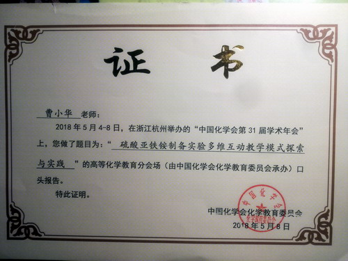 曹小华教授口头报告证书
