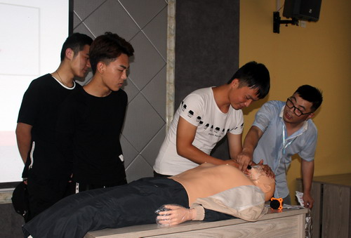 培训中,钱老师通过通过PPT演示、现场模拟操作、学生互动等方式讲授了心肺复苏和气道异物梗阻等理论知识、灾害现场的创伤救护及处理以及场景模拟等。为了使学生更深入了的了解各项救护技巧、掌握心肺复苏要领,培训老师将学员们分为二组,分别对心肺复苏等进行了实操演练、手把手向同学们传授了急救手法和注意事项,同时要求学员们熟练掌握心跳或呼吸骤停的现场急救、AED的使用、止血、包扎、骨折制动固定、搬运伤员等救护技术。最后,对学员们进行现场技能操作考核。