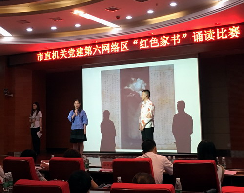 为迎接建党97周年,响应省委书记、省长刘奇同志向全省党员干部发出的“每位同志都要认真读一读红色家书”的号召,根据市委组织部和市直机关工委要求,市直机关各单位认真开展 “诵读红色家书”系列主题活动。6月15日下午,市直机关党建第六网络区在我校逸夫图书馆报告厅举行了“红色家书”诵读比赛。参加诵读活动的有市直机关工委领导、党建第六网络区参赛单位领导和职工代表160余人。
