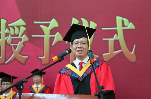 校党委书记赵伟为优秀毕业生代表颁发了毕业证书,全体校领导为毕业生代表拨流苏。