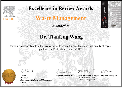 近日,化环学院王天烽博士荣获Elsevier出版社(Waste Management)颁发的2017年度 Excellence in Review Awards,以奖励其为Waste Management期刊审稿所作出的贡献。相关链接:https://www.sciencedirect-com/science/article/pii/S0956053X18304045。