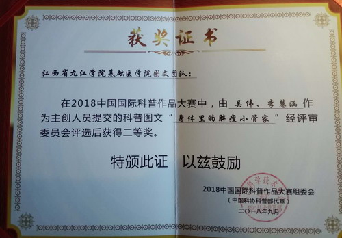 9月16日,2018中国国际科普作品大赛在中国科学技术馆圆满落下帷幕。由我校基础医学院吴伟老师和艺术学院李慧涵老师合作创作的《身体里的胖瘦小管家》喜获本次大赛科普图文二等奖。