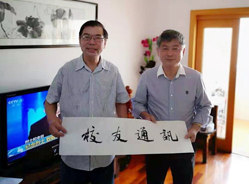 在其乐融融的攀谈中,在夏启国副校长的邀约下,崔廷瑶老师为我校正在创办的“校友通讯”内部期刊挥毫题字,并赠送了他个人的书法、绘画作品集。