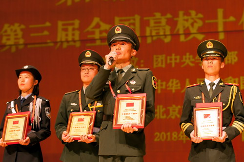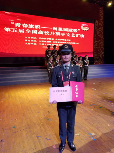 9月29日,由团中央学校部、全国学联秘书处主办,中国国旗网、北京新风旗帜文化传播中心承办,中国人民解放军陆军防化学院支持的第五届全国高校升旗手交流展示活动在9.3阅兵训练场成功举办。经网络投票、国旗下演讲、队列技术动作、国旗知识、国旗论文等多环节评比,我校国旗班班长邱鹏凯荣获“全国高校十佳标兵升旗手”和“赵班长升旗奖”,同时九江学院获优秀组织奖荣誉。朱德外孙刘建将军,原天安门国旗班第八任班长、全国高校升旗手总教官赵新风等嘉宾出席颁奖。