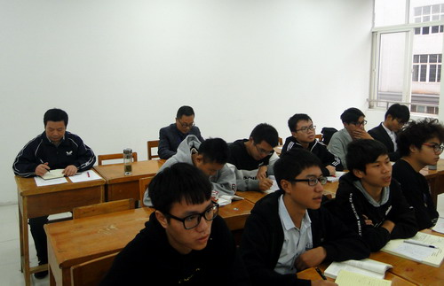 专家组组长朱林生教授在竞知楼102教室听取了《线性代数》课程并与授课老师交流。