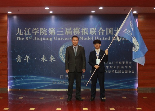 会上,校团委书记闫来英宣读了《关于成立九江学院模拟联合国协会的批复》,学生处处长刘平向模拟联合国协会授旗。大会委员会主席团指导、华中科技大学博士生江冬同学代表主席团致词,我校模联协会会长陈跃同学作表态发言。