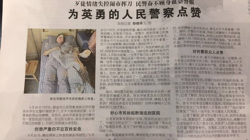 3月20日早上7时许,徐东华校友所在象湖派出所接到报警,市场上有一男子将肉摊上的刀抢走,在市汽车站对面不时挥舞,严重威胁人民群众生命安全。徐东华接警后,立即和同事赶往现场,与凶手进行搏斗,有效、及时地制服了凶手的犯罪行为,保证了人民群众的生命安全。但是,徐东华在搏斗过程中,被凶手砍断左手大拇指,左手掌大部也被砍断、肌腱断裂,额头、脚等多处被砍伤。徐东华的班主任徐常龙得知此事后,立即向药生学院党政领导汇报,学院领导高度重视,安排余副院长与班主任徐常龙代表学院去赣州看望住院治疗的徐东华,带去母校师生的关怀和慰问,希望他安心养病、早日康复。