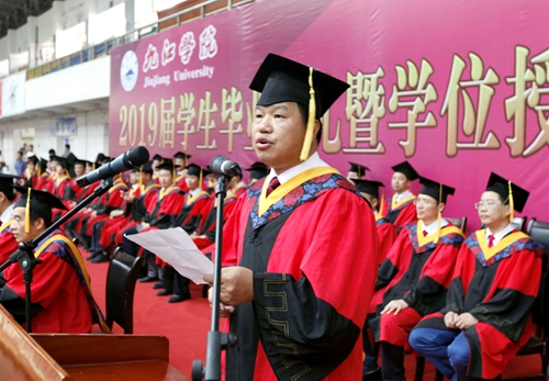 副校长王万山宣读授予学士学位学生名单,副校长陈春生宣读了2019届毕业生名单。2019年,我校一共有9552名毕业生在规定年限内修完《九江学院学生培养方案》规定内容,达到毕业要求,其中,76个本科专业的5007名学生毕业,57个专科专业4545名学生毕业。根据各二级学院学位评定委员会分会初审,校学位评定委员会批准,我校5001名毕业生获得学士学位。