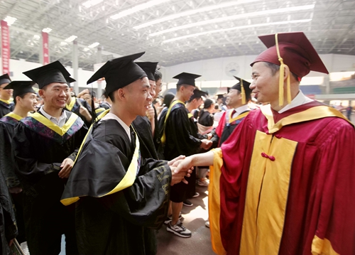 伴随着骊歌,毕业典礼在2019届全体毕业生们抛帽欢呼中结束,赵伟、刘晓东等校领导来到同学们中间,与他们合影、握手、话别。毕业生们徘徊在田径馆内外,和老师同学拍照留念,依依惜别。