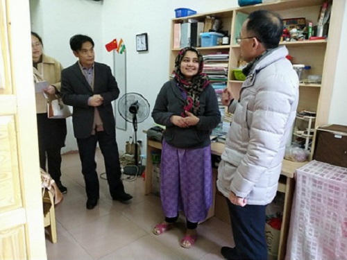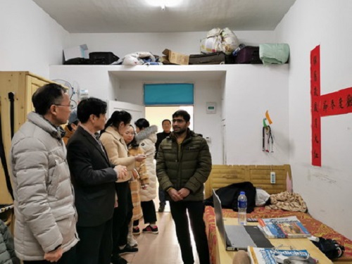 1月19日下午,副校长杨耀防到留学生宿舍看望了寒假留校的留学生,国际交流学院院长夏修龙、副院长何广等陪同看望。