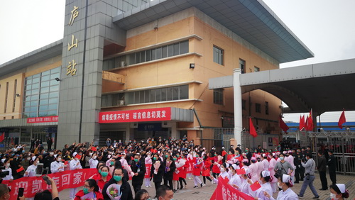 经过昨夜一场大雨的洗礼,庐山站显得格外清秀。站前小广场上,“致敬江西援鄂医疗队,家乡人民以你们为傲”、“临危请缨热血逆行,舍身战疫英雄凯旋”的大红横幅和标语格外引人注目;自发前来迎接的市民有序地环绕着他们,“你们辛苦了”,“欢迎英雄回家”的话语表达着家乡人民朴素的牵挂和思念,简朴而隆重的欢迎仪式正在这里举行。