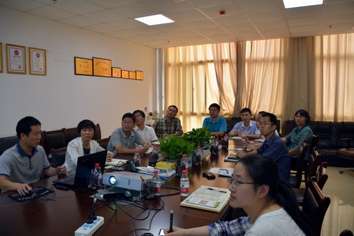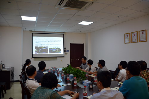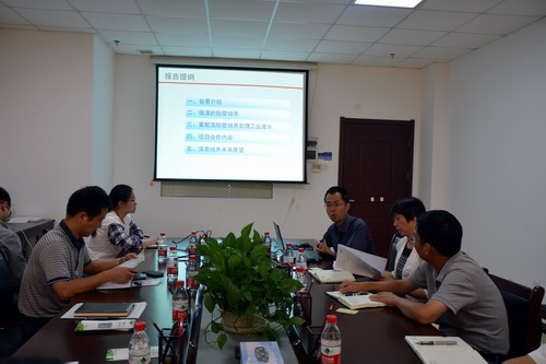 程鹏飞博士首先对自己科研方向,及2015年获批的国家自然科学基金项目“基于生物膜贴壁培养技术处理含Co2+工业废水的葡萄藻产烃与去除Co2+耦合机理研究”作了介绍,然后就双方共同申报的科技合作项目作了PPT汇报,在环境废水生物膜贴壁培养微藻技术方面达成了初步合作协议。