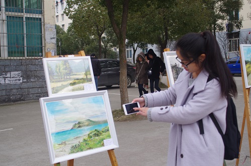 12月18日中午,艺术学院在学校三食堂前举办A1481班婺源写生艺术作品展,院长吴维勇、党委书记王春生、副院长虞斌、党委副书记沈杨以及教务科、学生科、团委负责人和部分老师和同学共同参加了此次婺源写生艺术作品展。