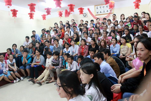 12月30日,柬埔寨王家研究院孔子学院学生在汉语教师志愿者的引领下,齐聚孔子学院大楼门前,共同祝贺孔子学院六周年生日、迎接新的2016年。