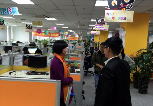 4月6日上午,考察组一行首先来到苏州昆山华泛信息服务有限公司了解我校学生实训情况。公司主管人员对我校同学从前期岗前培训到上线工作初期的表现给予了肯定。在与同学交流实训心得过程中,同学们表示对电商平台运营流程尤其是客服业务相关操作有了更加深入的理解和掌握。