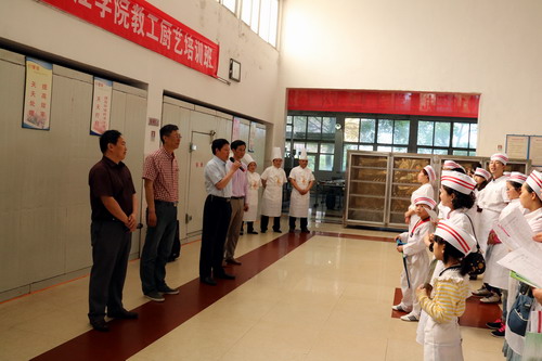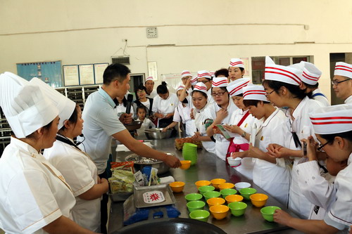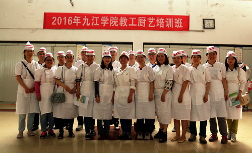 为丰富广大教师业余文化生活,科学改善家庭膳食结构,提高厨艺水平,同时积极推进工会和后勤饮服中心为师生服务能力建设,饮服中心举办了2016年九江学院首届教工厨艺培训班。经过一个多月的策划、筹备、报名,全校共有580余名教师报名参加培训。5月14日上午8:30,首届教工厨艺培训班在我校白案配送中心正式开班,党院办、组织人事部、纪委、外国语学院、经管学院等部门教工代表作为首期培训班学员参加了开班仪式。校工会主席金葆金、后勤管理处处长姜东升、工会副主席支少华出席了开班仪式,开班式由饮服中心主任蔡飞主持。