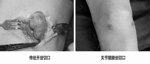 传统的腘窝囊肿开放手术单纯切除囊肿,由于不处理关节内疾患和关节囊内的单向流通现象,可导致术后复发率高达50%以上。另外还具有切口大、恢复慢、影响美观等缺点。